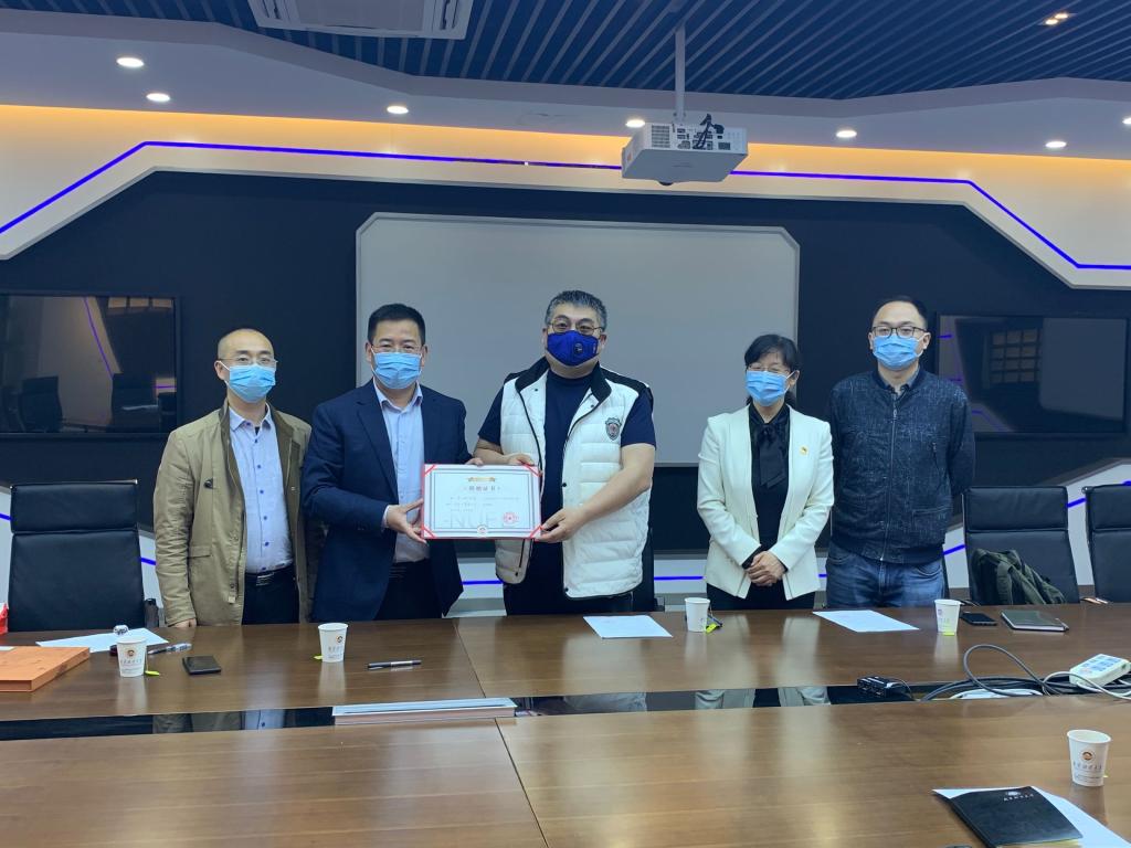 4月26日下午,我校97级校友、南京苏迈瑞尔纺织品贸易有限公司董事长陈永刚来到我校,作为企业代表向信息工程学院捐赠一万只口罩,助力我校疫情防控工作。对外联络处副处长王冲代表学校为陈永刚校友颁发了捐赠证书,信息工程学院党委书记周亚芳代表学院接收了捐赠物资。