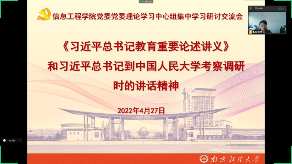 4月27日下午,信息工程学院线上召开党委中心组集中学习研讨会,集中学习《习近平总书记教育重要论述讲义》中的部分章节和习近平总书记到中国人民大学考察调研时的讲话精神。全体院领导、党委委员参加集中学习研讨。院党委周亚芳书记主持了会议。