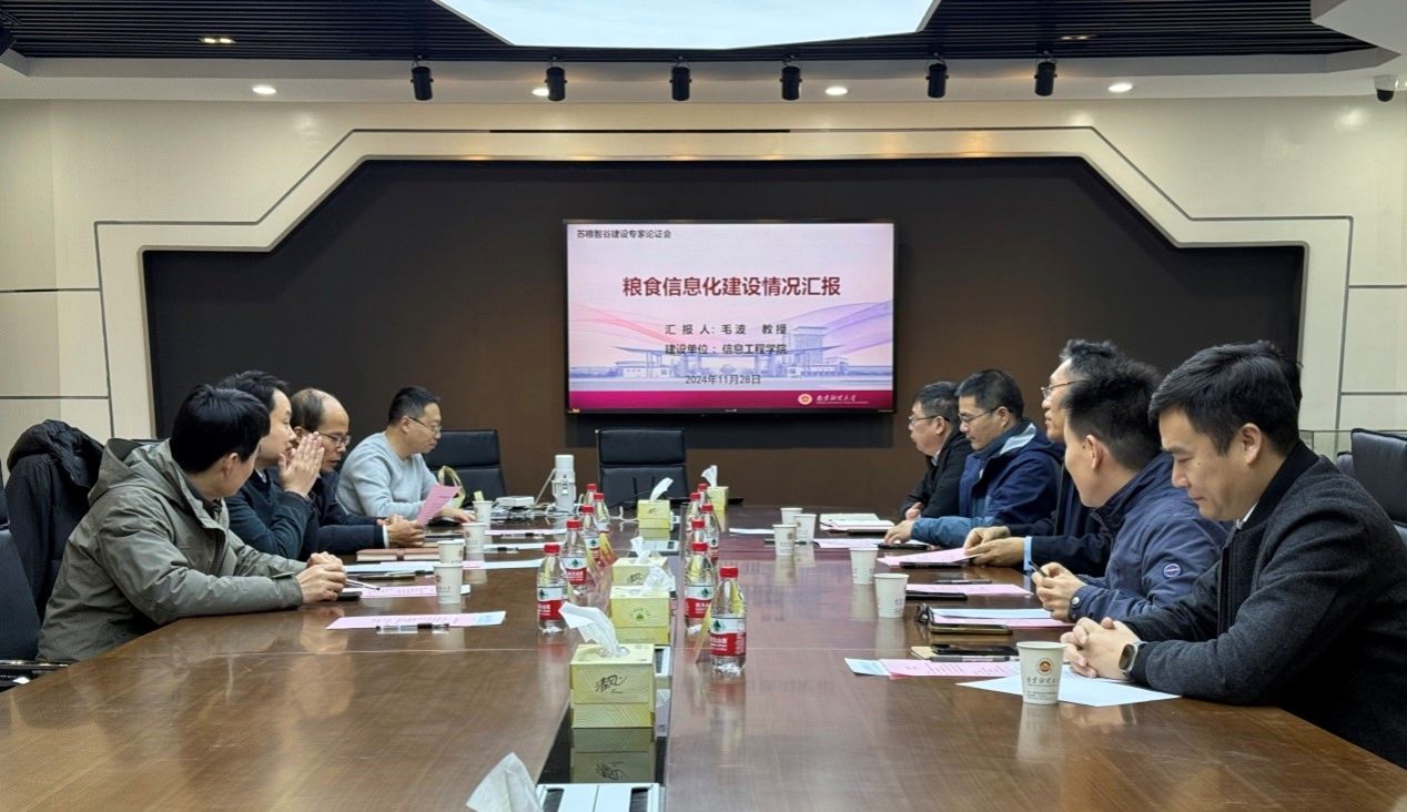 特邀来自江苏省粮食集团、南粮集团、无锡中粮工科、苏州苏垦现代农业发展有限公司、中储粮江苏质检中心、江苏有线数据网络有限责任公司等单位的专家对苏粮智谷建设情况进行专业指导和论证把关。校科研院院长方勇、食品科学与工程学院院长唐培安、信息工程学院院长黄健、信息工程学院院长助理毛波、食品科学与工程学院教授万忠民等参加会议。