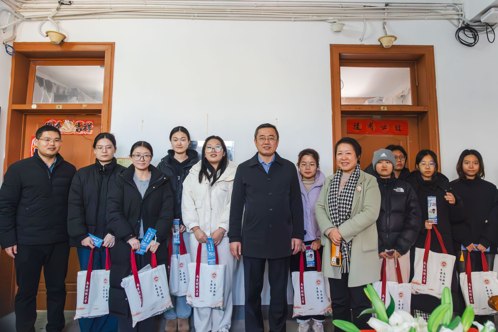 赵国栋副校长与学院考研学生亲切交流,询问报考院校、近期备考情况、身心状况等。他代表学校向同学们表达最真挚的祝福,对大家在备考期间展现的认真专注、拼搏进取的精神风貌予以充分肯定和赞赏。他叮嘱同学们在最后冲刺的关键阶段,合理规划、劳逸结合,注意保暖和饮食安全,保持平和稳定的心态,以最佳的精神状态迎接考试。赵国栋副校长要求学院高度重视本科生升学深造工作,不遗余力地为同学们创造良好的考研条件与环境。他衷心预祝同学们在考试中发挥出色,实现自己的梦想。最后,赵国栋副校长为考研学生送上内含文具福袋、保温杯、能量咖啡券等物资的“考研加油包”,表达学校的关心和支持。