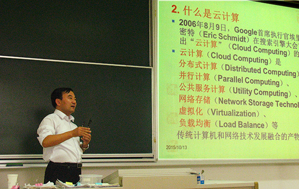 吉根林主任指出时空数据挖掘是数据挖掘领域的前沿研究课题,他概述了时空数据挖掘的相关概念、主要分类及研究现状、应用领域,并着重讲述了面向大数据的时空挖掘的系统构架和时空大数据挖掘面临的挑战。吉根林教授还介绍了自己主持的国家级研究项目——“云计算环境下移动互联网用户时空轨迹模式与用户关系挖掘”,为师生尽快进入该研究领域指明了方向。