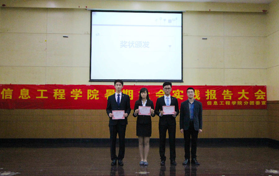 活动伊始,分团委副书记把冰倩同学向大家介绍了信息工程学院今年暑期社会实践的总体情况。接下来,分别有四支院级立项团队的代表与三位分散实践的个人上台发言,向同学们分享了自己在社会实践活动中的宝贵经历和感受。