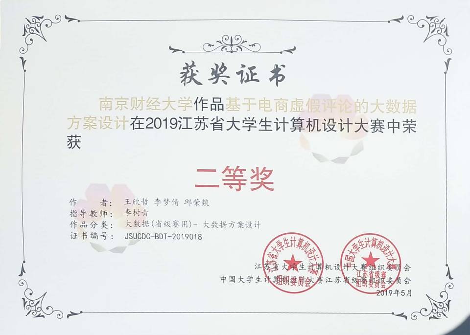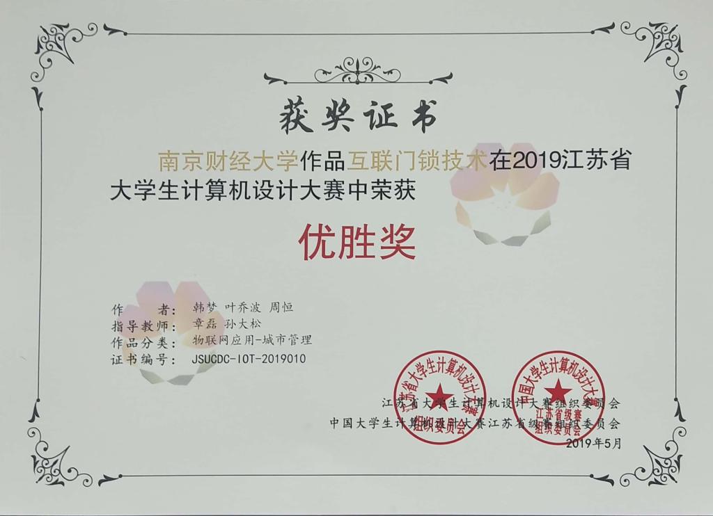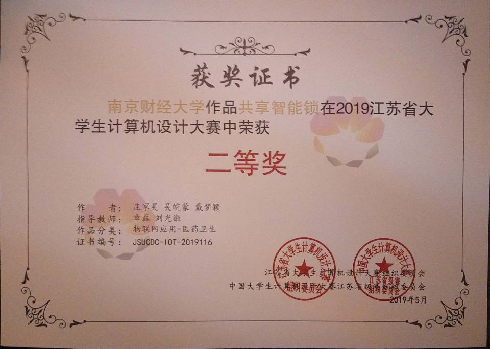 李树青老师指导,2018级李梦倩、王欣哲、邱荣燚等三位同学创作的“基于电商虚假评论的大数据方案设计”获得“大数据(省级赛用)- 大数据方案设计”普通组本科组二等奖,由章磊老师指导,2016级庄家昊、吴皖蒙、戴梦颖等三位同学创作的“共享智能锁”荣获“物联网应用-医药卫生”组本科组二等奖,由章磊老师指导,2016级韩梦、叶乔波、周恒等三位同学创作的“互联门锁技术”荣获“物联网应用-城市管理”本科组优胜奖。前两支队伍将代表我校参加2019年中国大学生计算机设计大赛普通组现场决赛。
