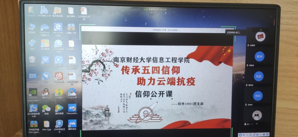 各团支部利用钉钉直播,QQ课堂,腾讯课堂等平台认真学习习近平总书记给北京援鄂医疗队全体“90后”党员的回信精神,在线上开展“传承五四信仰,助力云端战疫”信仰公开课,全院大一至大三以及研究生共有17个团支部参加。活动包括三项内容:一是由各团总支书记主持,全面介绍本次主题团日活动的重要意义;二是微团课,观看武汉战“疫”纪录片,习近平总书记给北京大学援鄂医疗队全体“90后”党员的重要回信,重温习近平总书记“4·19”重要讲话 打好互联网战“疫”;三是团员代表分享活动感悟和奋斗目标。