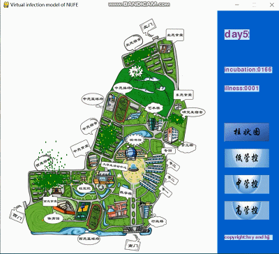该模型基于南财地图,以python为编程工具,同时使用pygame引擎,模拟在低、中、高三种管控下的校园疫情传染情况。模型中设置健康、潜伏期、患病三种人群,在寝室、教室和食堂三个区域移动的场景,采取没有措施的低管控、戴口罩等低级防护的中管控、增设隔离区等严密防护的高管控三种场景,实现在不同传染率下的模型。通过实现可视化的GUI、学生活动随机化的算法、使用字典的检测优化算法,以及人员分布数据的图表等,使大家更直观清晰的获得校园里同学们流动下的传染状况,同时提醒各位同学,在校期间,服从学校管理,务必在宿舍进行自我隔离,做好个人防护,尽量减少出行,避免校园里扩大感染范围。