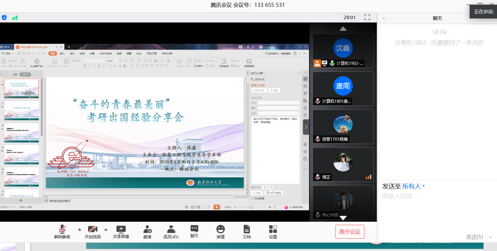 5月30日16:30,在信息工程学院组织下,“奋斗的青春最美丽”考研出国经验线上分享交流会成功举办。本次会议旨在帮助同学们进一步了解考研和出国方面的经验,为有需求的同学们提供交流机会,特别邀请到2016级优秀毕业生吴皖蒙,周恒以及方泽强来给在校生们作经验分享。
