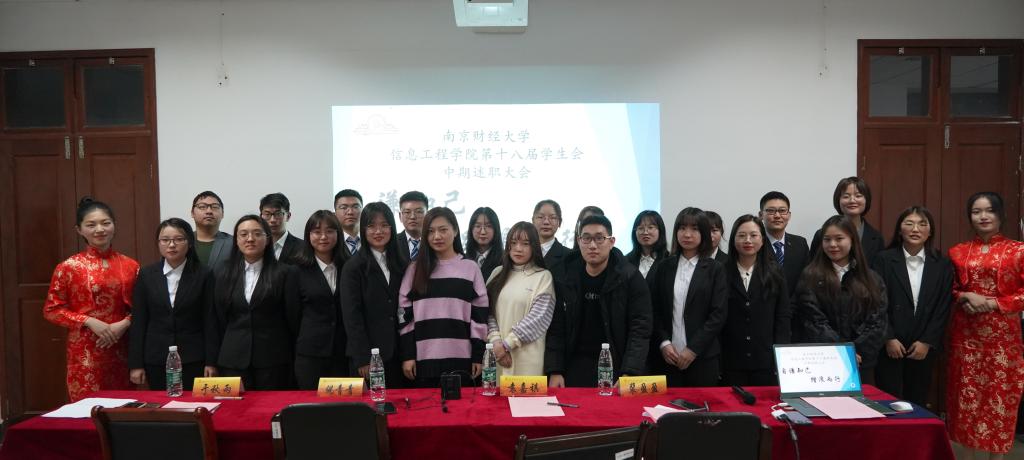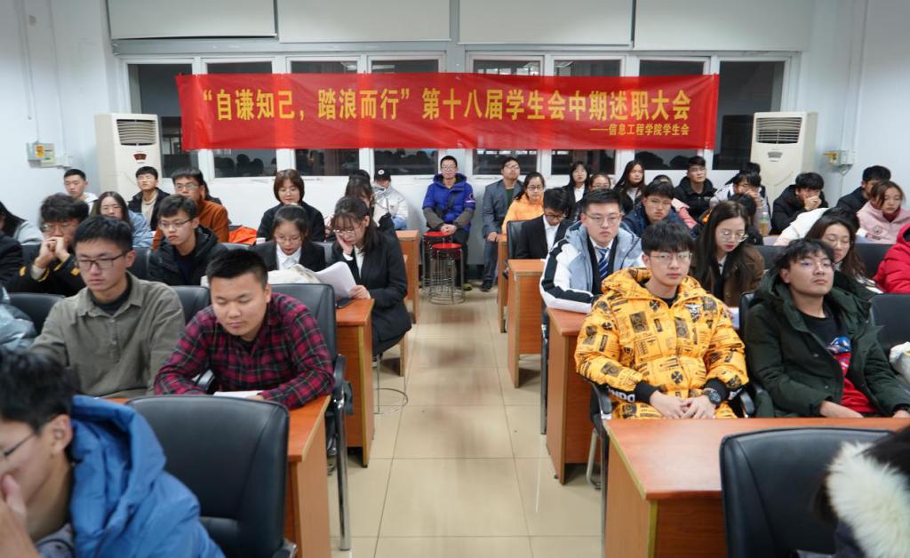 第十八届信息工程学院学生会“自谦知己,踏浪去行”中期述职大会。出席本次大会的有:信息工程学院倪青青老师,学生会主席于秋雨、裴盈盈、袁嘉祺,各班班级代表以及学生会全体成员。