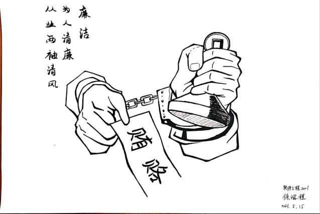 软件工程2001班的徐谊程同学将廉洁绘在纸上,手握权力也不能无所不为,贪腐没有免罪牌,纪法面前不存在“功过相抵”,遵纪守法才是真正的“平安符”,要将权利关在制度的笼子里,如若不然只会面对法律的制裁。党员领导干部要扣好人生的每一粒“扣子”,在党纪国法的保护、约束下,认真工作、积极生活、敬畏纪法,时刻保持自重、自省、自警、自励,如此才能确保精神富足和内心安宁。