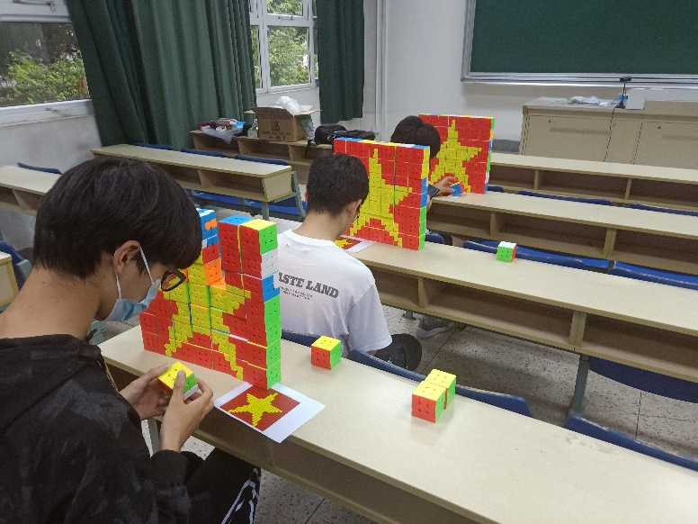 活动当天下午,组织者在进行短暂的活动流程宣讲后,便对社团成员进行细致的魔方拼图教学,紧随其后的是拼图竞速比赛,以最终最快拼成红底党心为标准,旨在魔方知识的学以致用,更在宣扬本次活动主题,我心向党,砥砺前行。