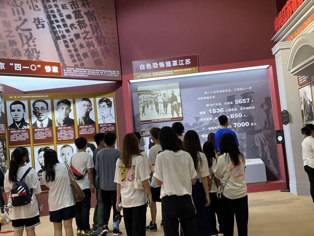 继续向里走,转个弯就进入了室内展区,室内展区主要是以中国共产党在江苏波澜壮阔的奋斗历史进程为主线,一共分为“建立党的组织、为新民主主义革命胜利作出重要贡献”,“在探索中前进、进行社会主义革命和建设”,“实行改革开放、推进中国特色社会主义江苏实践”,“决胜全面小康、交出‘强富美高’新江苏建设的时代答卷”四个部分,详实地记录了自1921年至2021年间中国共产党在江苏从无到有、不断壮大的历史伟业,讲述了江苏在百年奋斗中取得的辉煌成就。
