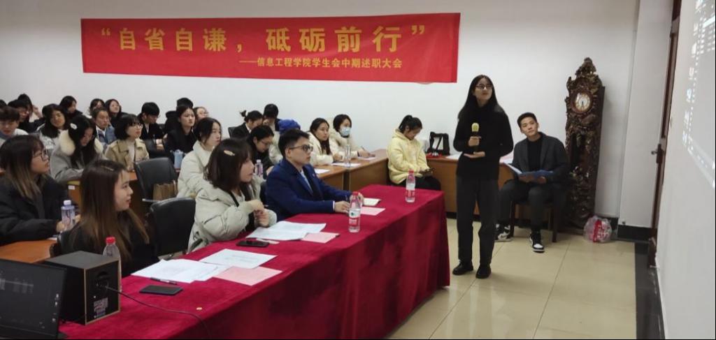 会议开始,学生会主席王景(大数据1901班)为学生会本学期的工作做总结发言,她肯定了学生会各中心本学期的工作表现,同时指出了学生会今后工作的改进方向。随后,大会正式进入述职答辩环节。各中心按照媒体融创中心、服务维权中心、学业发展中心、素质拓展中心、综合事务中心、对外交流中心的顺序依次上台述职答辩。中心负责人对各自中心一学期的工作情况作概述,总结了工作上的得失和经验。述职结束后,主席团根据各中心工作情况向负责人提出问题,双方共同探讨工作中遇到的问题和未来的工作方式。各部门述职答辩后,主持人播放了本学期学生会风采展示视频。视频记录了项目志愿者和负责人刻苦奋斗的身影和精彩纷呈的活动瞬间。