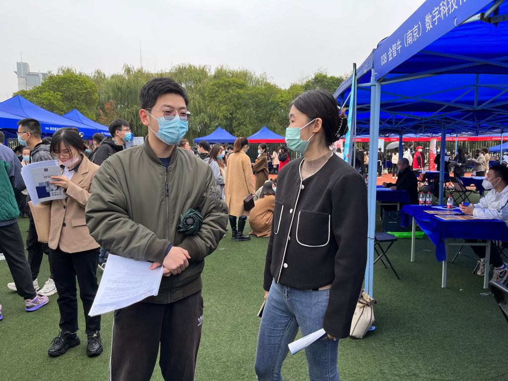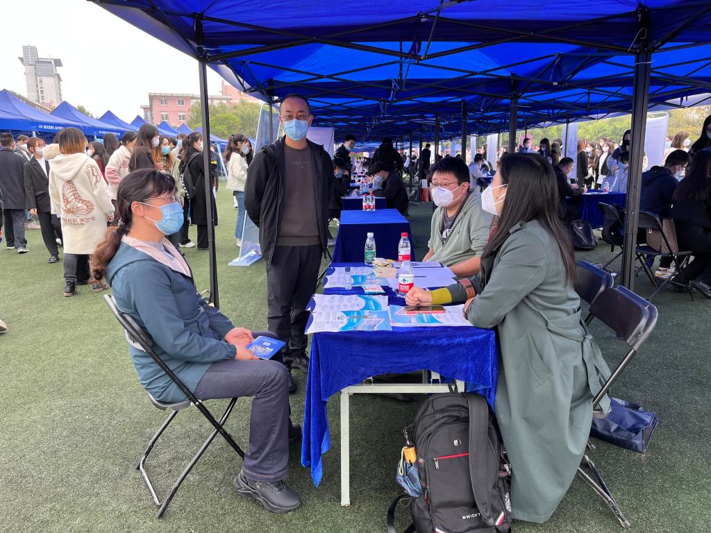 仙林校区内进行校园招聘会,信息工程学院党委书记周亚芳、党委副书记袁军和学工系统老师深入招聘会现场,与企业直接面对面进行交流,向企业推荐优秀毕业生。