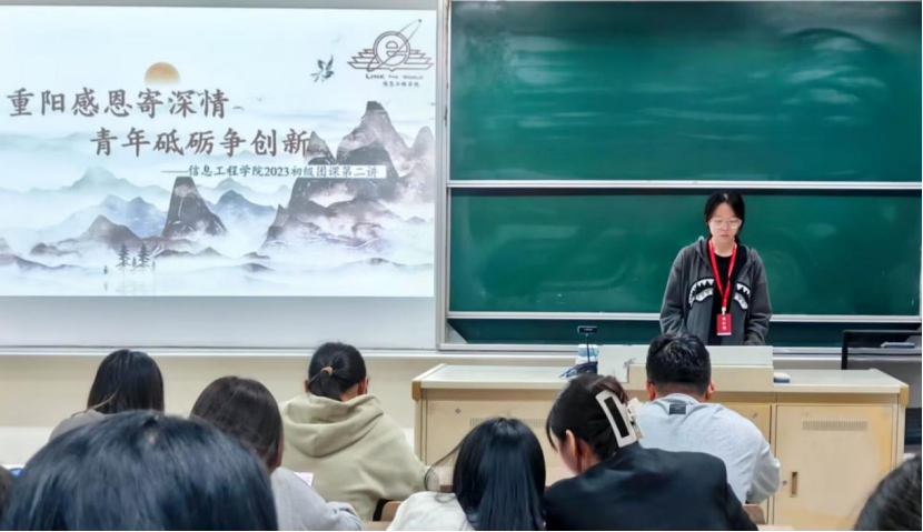 净境重阳节,仙游万乘来。为使同学们能在大学新阶段更好地认识重阳节,坚持传承传统节日,传递爱老敬老精神,10月19日,信息工程学院在博观楼110开展“重阳感恩寄深情,时代新进传美德”初级团课第二讲。