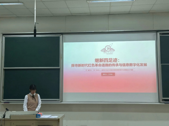 其次,“继新四足迹:探寻新时代红色革命道路的传承与信息数字化发展”团队队长王宇佳,从确立主题,到明确流程,到实践过程,到实践反思,到完善项目讲述自己组织团队实践的经验。