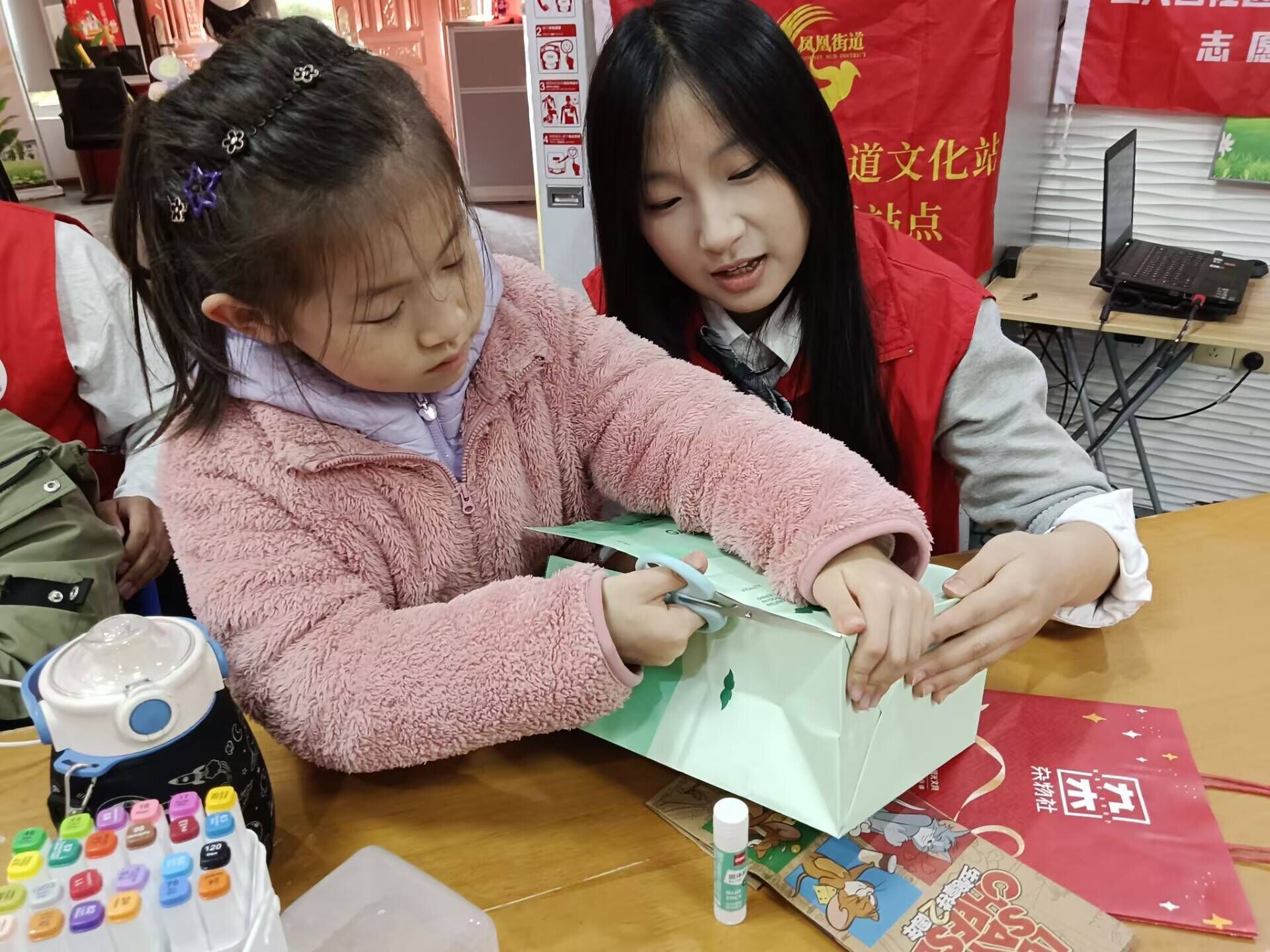 志愿者与小朋友合作做手工