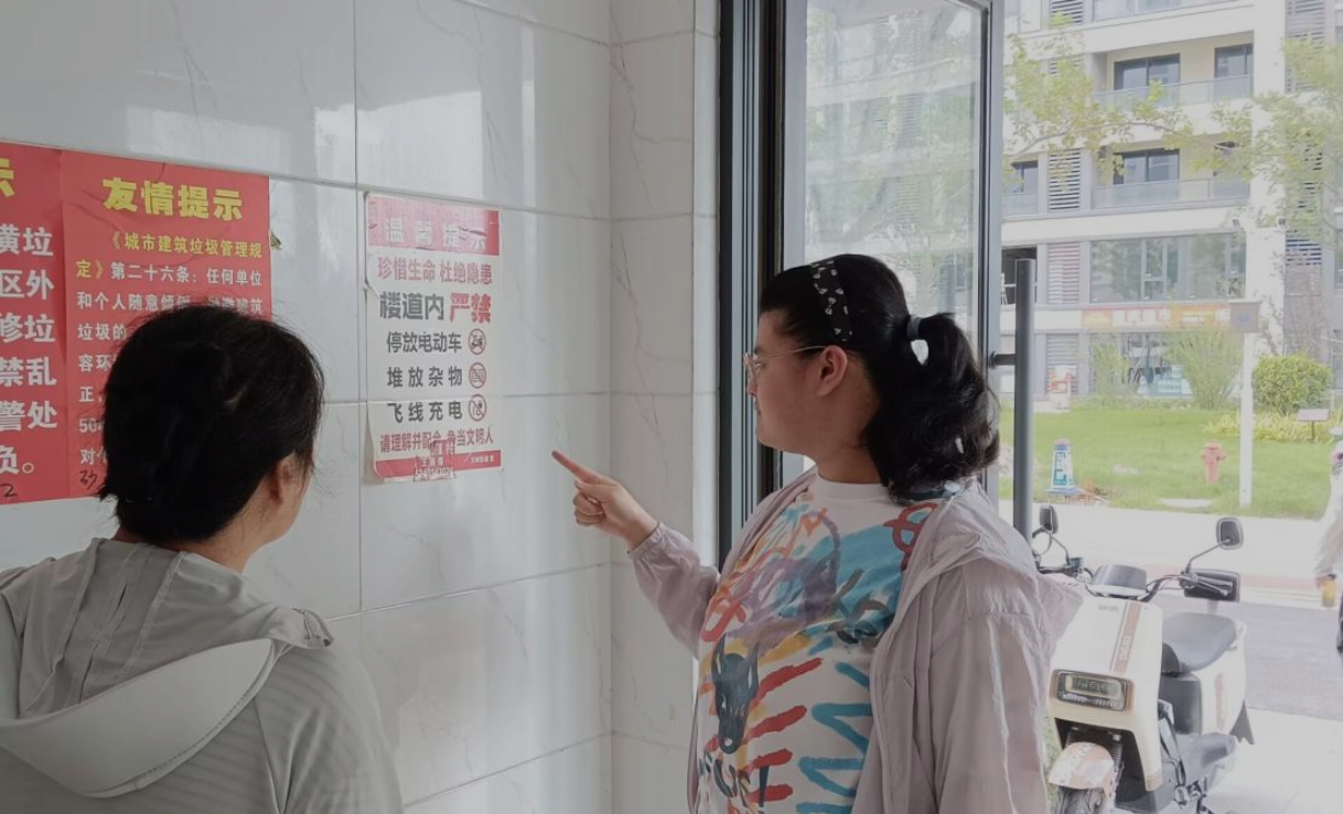 与此同时,在江苏省盐城市迎宾新村小区,实践队员姜文婷积极协助社区工作者开展“安全+整洁”双促行动。姜文婷同学认真清扫小区路面及绿化带垃圾,规整乱停放的自行车、电动车,使公共区域恢复整洁有序。同时,她还协助工作人员向居民普及电动车安全充电要点及消防隐患应对措施,并在电梯张贴警示海报,有效减少了楼道违规充电现象,获得居民的积极反馈。最后,姜文婷同学协助社区工作者在小区广场设立宣传点,通过趣味问答讲解文明养犬的重要性及相关案例,并针对高空抛物和夏季防暑,协助录制方言版广播循环播放,同时在微信群发布警示案例。