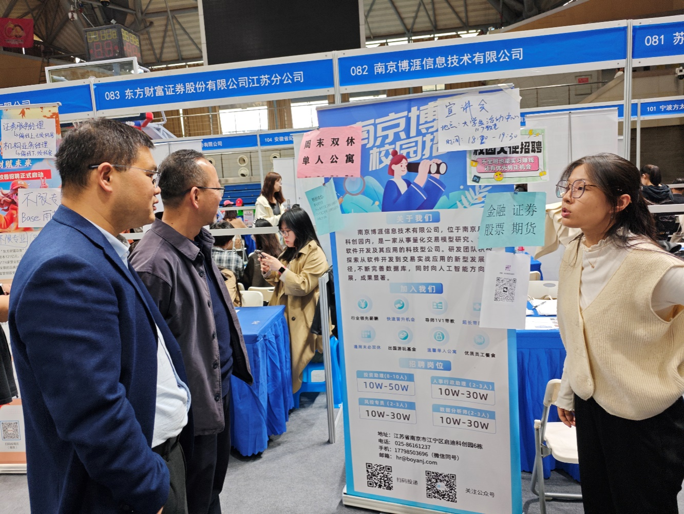在招聘会现场,学院领导、老师不时在招聘单位展位前驻足,收集招聘信息,并通过班级群及时发送给毕业班同学,督促同学们及时参加招聘活动。在无锡信捷电气股份有限公司、南京博涯信息技术有限公司、江苏联宏智慧能源股份有限公司、宏智科技(苏州)股份有限公司、昆山农商银行、江苏省水利勘测设计研究院有限公司等招聘与学院专业相关的单位展位前,学院领导与招聘单位负责人进行深入交流,介绍学院的专业设置、人才培养等情况,加深双方了解,进一步深化与相关用人单位的校企合作,为学院毕业生拓展就业渠道和就业岗位。