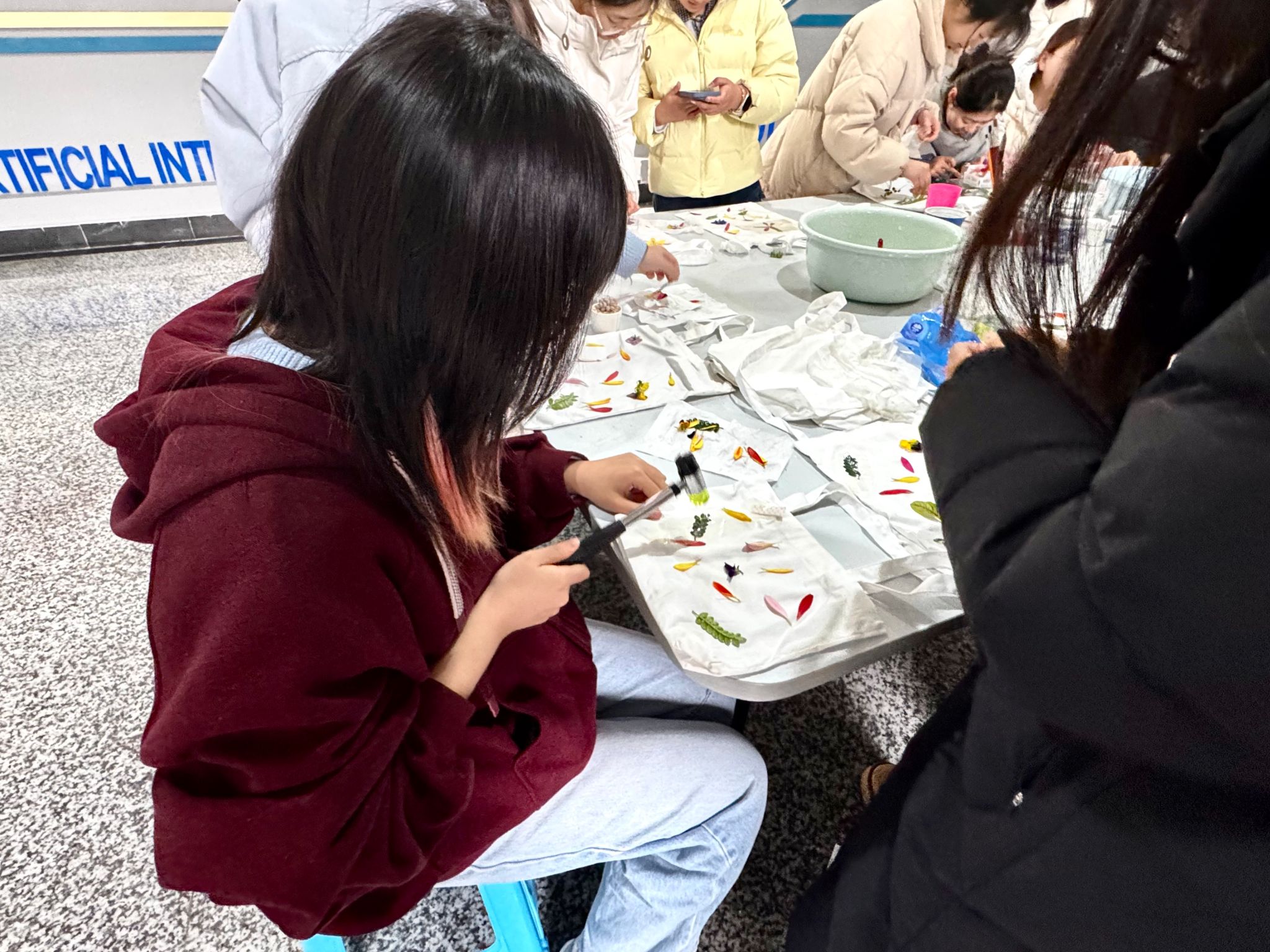 同学们在用植物拓印帆布包