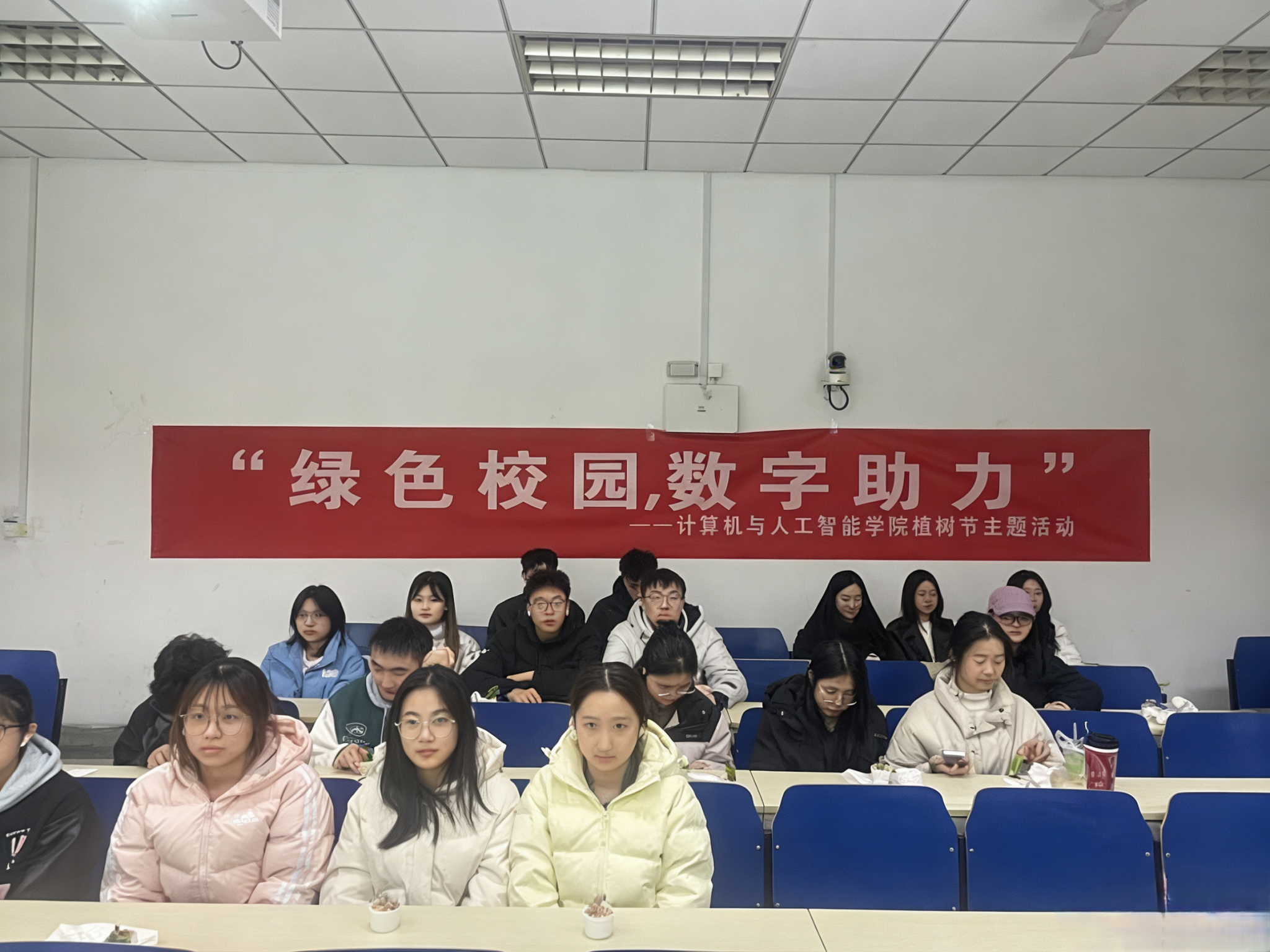 同日,德业楼108教室开展了以“绿色校园,数字助力”为主题的环保科普与“数字绿化”体验活动。活动以环保课堂为起点,主持人结合具体数据讲解树木的生态价值,介绍我国森林资源保护成果,让同学们深刻认识到植绿护绿的重要意义。趣味环保问答环节围绕森林防火、植树技巧、绿色发展理念等内容展开,同学们踊跃作答、积极互动,在轻松的氛围中巩固环保知识,答对者还收获了精美小礼品,让绿色理念入脑入心。在数字绿化体验环节,大家共同观看教程视频,了解“蚂蚁森林”低碳种树模式,知晓走路、乘坐公共交通等低碳行为可转化为绿色能量并兑换真实树苗的公益形式,随后纷纷拿出手机线上领养树苗,用指尖行动为生态保护助力。实地成果视频的播放,更让同学们直观感受到点滴低碳行为凝聚的生态力量。活动最后,多肉栽种实践如约而至,工作人员分发 DIY 材料包,细致讲解栽种步骤与四季养护技巧,同学们亲手栽种多肉盆栽,互相交流心得,在动手实践中体验植绿的乐趣,让绿色期许在指尖生根。