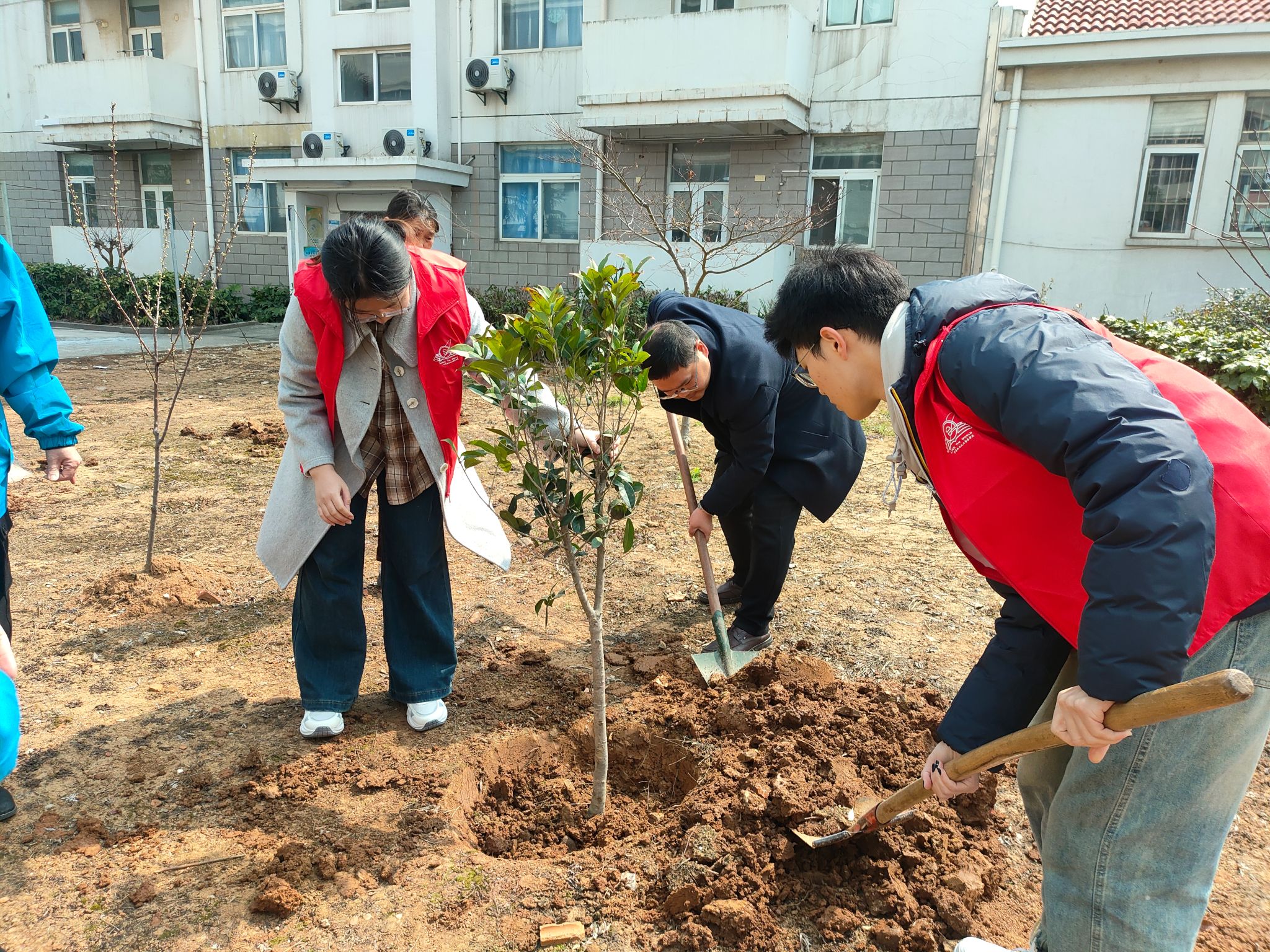 3月12日中午,学院将植树节活动推向实践高潮,在北苑12号站组织开展“植绿护绿・共筑青春校园”实地植树活动。院党委副书记马健,辅导员郭秀芳、杨佳宁老师与宿管站阿姨们来到现场,与同学们一同挥锹植绿,共筑美好校园。活动现场,同学们热情高涨、干劲十足,三人一组、分工协作,挥锹铲土、培土围堰、提水浇灌,每一个环节都认真细致,铁锹与泥土的碰撞声、欢声笑语交织成春日校园最美的绿色乐章。树苗栽种完毕后,同学们认真填写树牌与卡片,将树种名称、青春寄语与美好祝愿一一记录,让每一棵树苗都承载着情感与责任,让爱绿护绿的观念深植心中。经过一个多小时的辛勤劳动,一棵棵新苗在春风中昂然挺立,为校园增添了一抹盎然生机。