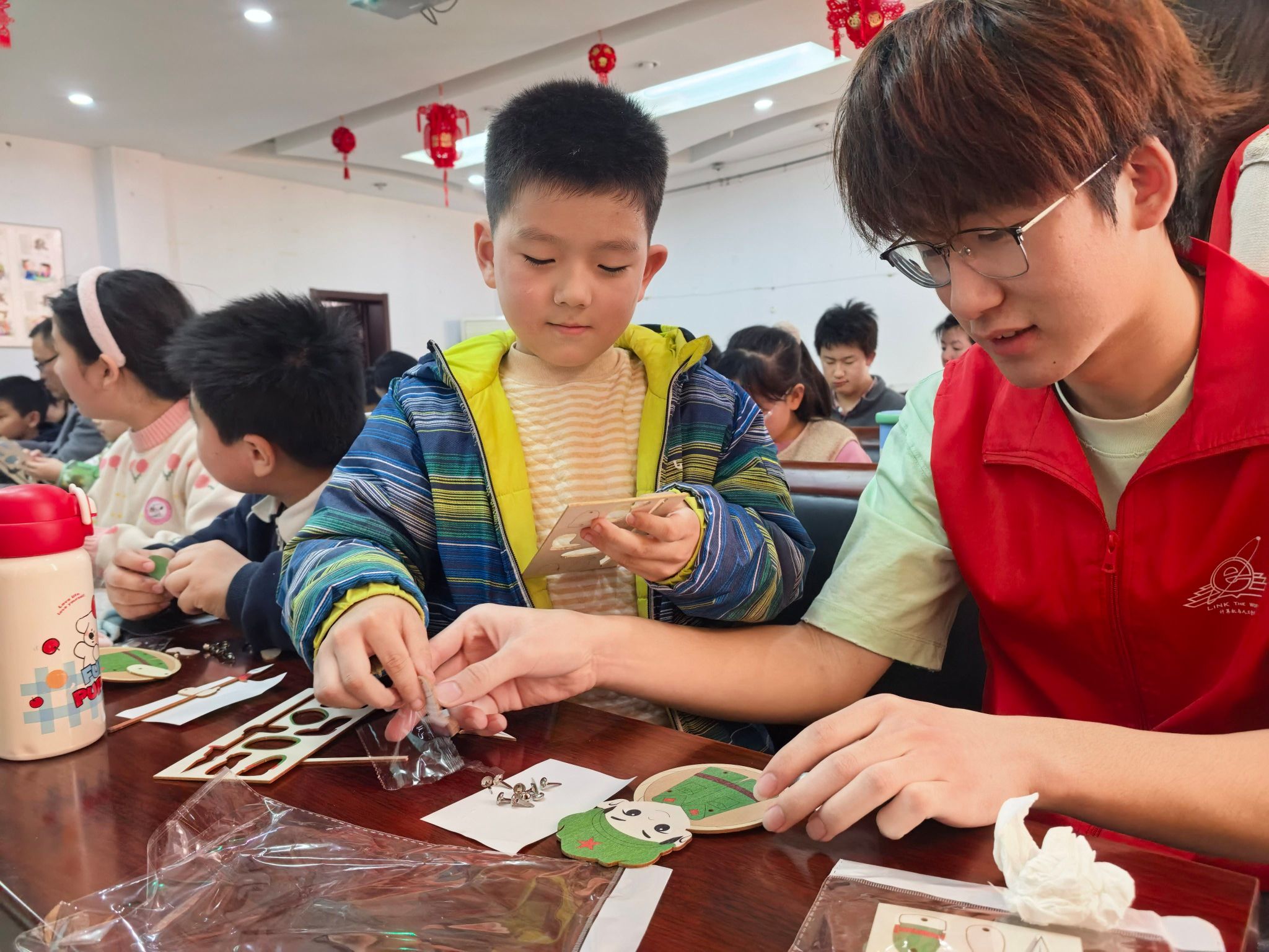 回到室内,活动的最后一站是手工环节——制作雷锋小人偶。桌上摆满了预先裁剪好的纸板部件,志愿者们手把手地教孩子们如何组装。孩子们低着头,小心翼翼地拼接,不时传来“求助声”,志愿者们穿梭其间,耐心帮忙调整。不一会儿,一个个雷锋人偶在孩子们手中诞生——戴着军帽,挺着胸膛,仿佛在无声地诉说着榜样的力量。