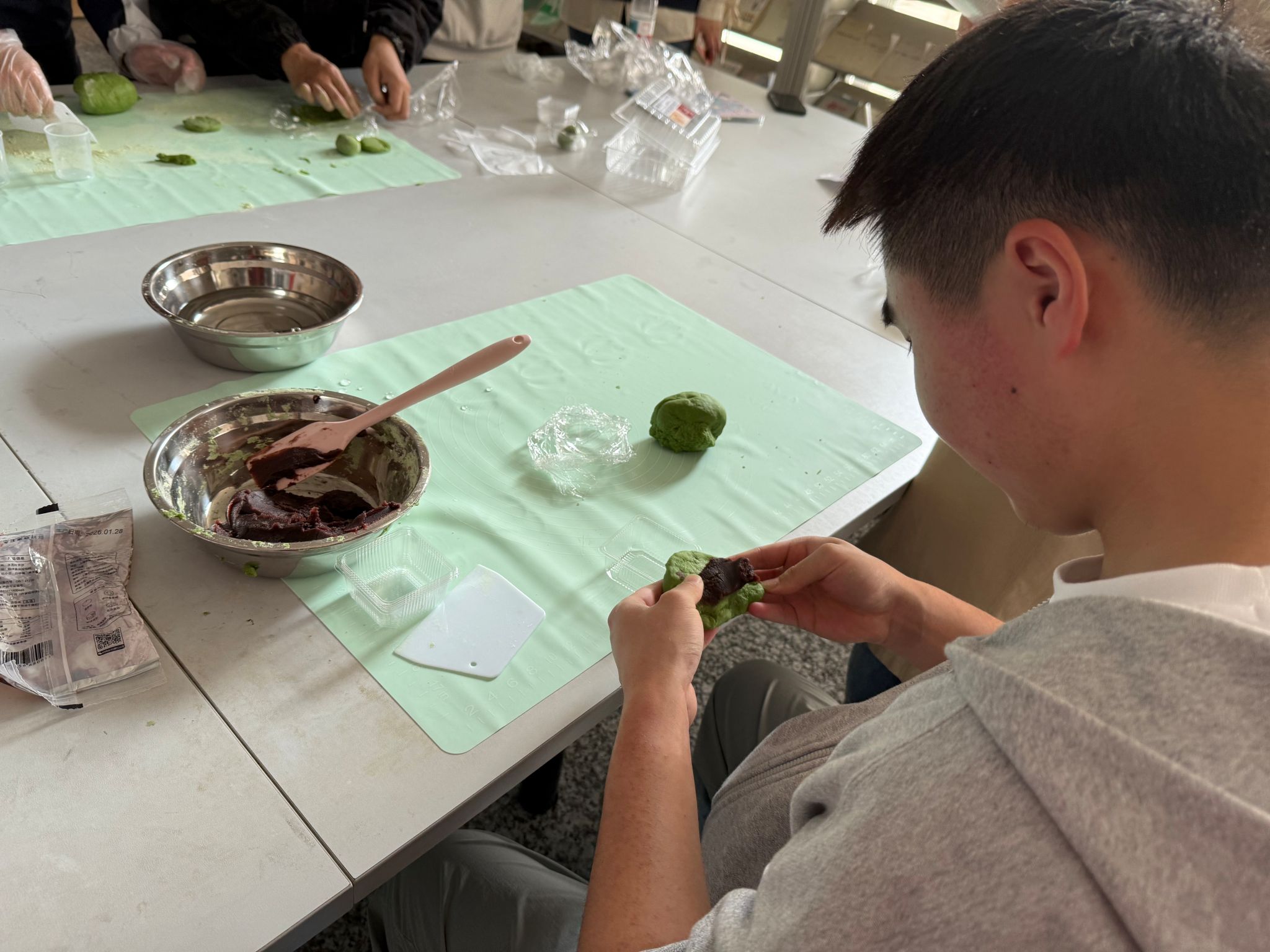 午餐后,德业楼内的清明主题实践活动成为核心亮点。青团制作区,桌上整齐摆放着青团预拌粉、温水、红豆沙馅、蛋黄肉松馅以及精致的包装盒。同学们将碧绿的青团粉倒入盆中,缓缓加入温水,一边搅拌一边揉搓。不一会儿,原本松散的粉末就变成了光滑柔软、富有弹性的面团。大家将面团分成均匀的小剂子,按压成圆片,舀入一勺自己喜爱的馅料——或是绵密的红豆沙,或是咸香的蛋黄肉松。轻轻收口、搓圆,一颗颗圆润饱满的青团便在掌心中诞生,散发着淡淡的糯米清香。同学们将亲手制作的青团小心装入盒子中,准备带回与朋友分享。来自江苏警官学院的一位同学笑着说:“以前都是买现成的,今天自己揉面、包馅,才知道青团这么做出来的,感觉清明更有味道了。”高清av