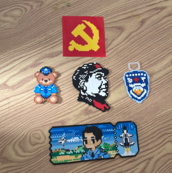 创意拼豆区同样热闹,五颜六色的豆粒在学子手中化为别样表达。除了春日花草、卡通形象,警营特色与红色元素格外醒目,有人拼出了毛主席戴军帽的经典头像,神情庄重而亲切,表达了对伟人的敬意;还有同学用红色和黄色的小豆子仔细拼出了中国共产党党徽——镰刀与锤头的图案在金色底纹上熠熠生辉,每一件作品都凝结着青年对党和国家的敬意、对革命先辈的敬仰、对职业的尊重。大家专注拼搭、加热定型,将校际情谊与清明追思融入方寸挂件。