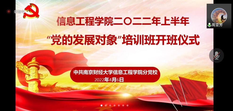 2022年4月6日13时,信息工程学院分党校以线上的形式举行了2022年上半年“党的发展对象”培训班开班仪式。开班仪式由本科生第一党支部书记张婷老师主持。