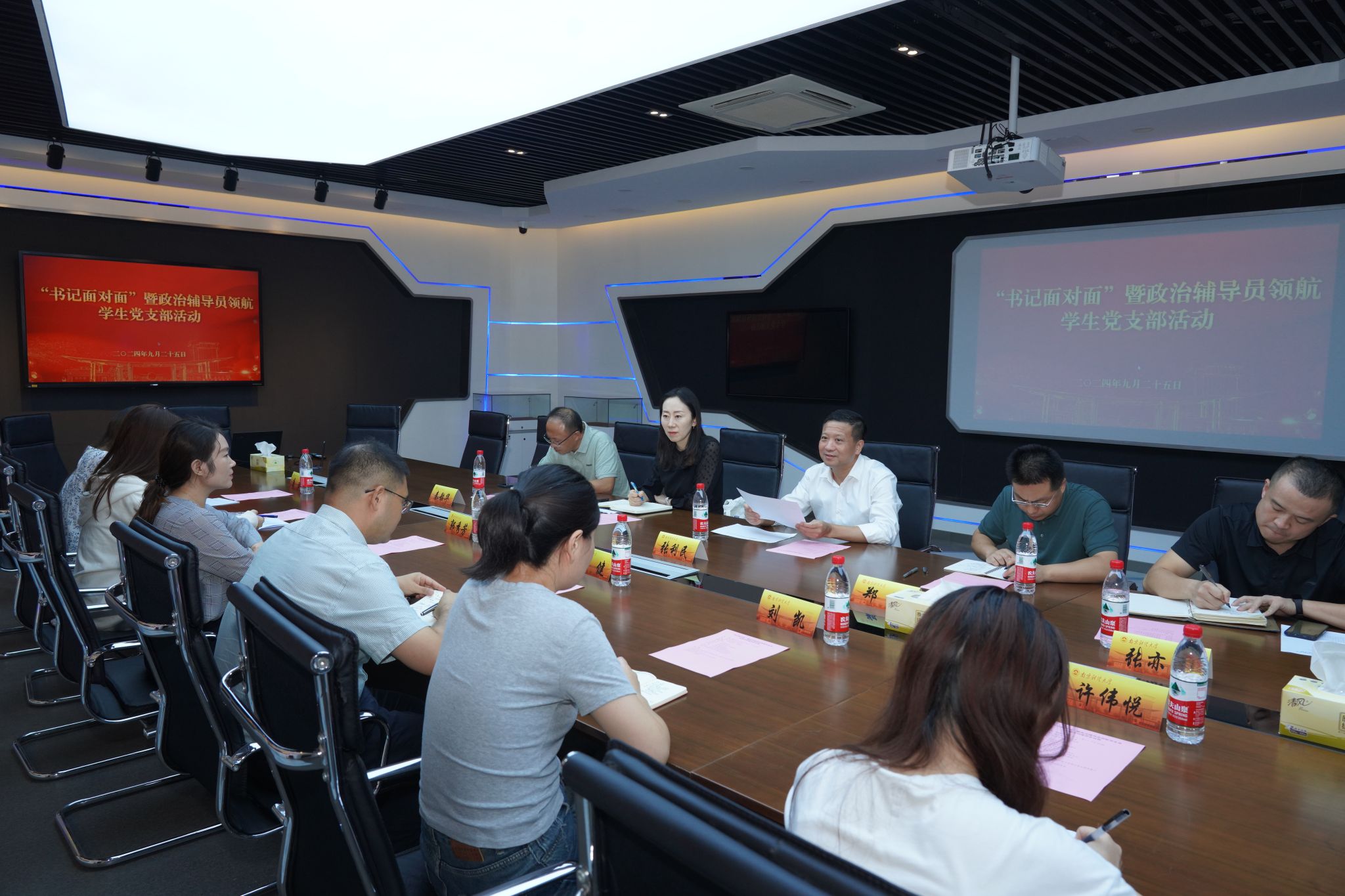 9月25日下午,校党委书记张利民到仙林校区17号研究生宿管站412寝室看望结对联系的学生宿舍的同学们,并在德业楼211会议室参加“书记面对面”暨政治辅导员领航学生党支部座谈会。党政办主任郑锷、党委研究生工作部部长郝园园、党政办副主任张亦佳、党委宣传部副部长秦韶华、信息工程学院党委副书记马健参加活动,信息工程学院研究生党支部书记郭秀芳及支委会成员参加座谈。